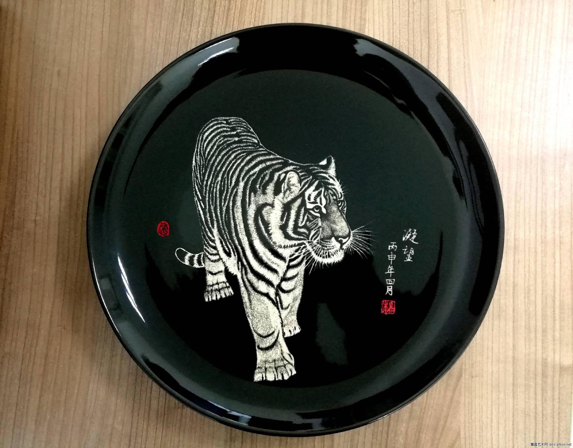 客户定制 黑色釉手绘白虎陶瓷纪念盘